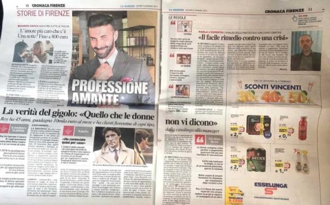 «Certo – continua Roy – non mancano le single, in cerca di un’evasione piacevole, soprattutto durante le vacanze, ma la mancanza di sesso è più frequente all’interno del matrimonio. Sono molte anche le coppie di amanti fiorentini che, in vena di trasgressione, mi chiamano per incontri a tre. E poi c’è anche tutto un filone dei mariti voyeristi che amano vedere la propria signora in compagnia di un altro». Insomma, la piazza fiorentina, e quella toscana in generale, è fiorente per questo gigolo. «Tra le mie clienti ci sono casalinghe e professioniste e non necessariamente sono facoltose: se una donna sente il bisogno del servizio che posso offrirle, è pronta anche a chiedere denaro in prestito».